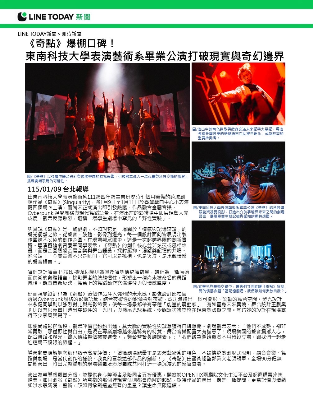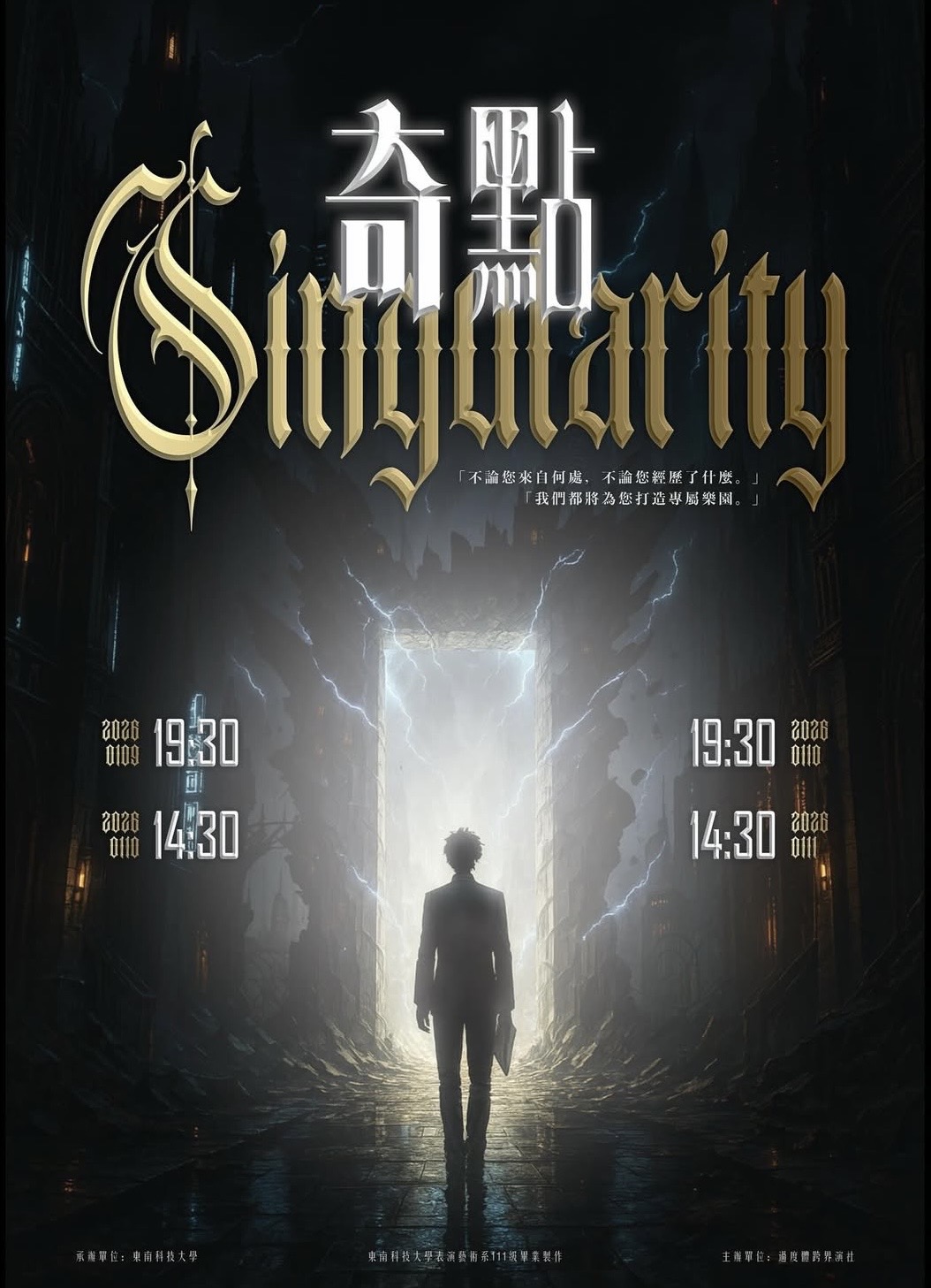 由東南科技大學表演藝術系第八屆畢業生籌備的跨域劇場作品《奇點》(Singularity),將1月9日至1月11日於臺灣戲曲中心小表演廳上演,作品融合金屬音樂、Cyberpunk 視覺風格與現代劇場和肢體語彙結合視覺投影,打造出介於夢境與未來之間的劇場語言,展現畢業生對記憶無感知的獨特想像。導演顧問陳昶旭老師也給予高度評價:「這種劇場能量正是表演藝術系的特色,不被傳統戲劇形式限制,融合音樂、舞蹈與劇場,是當代創作的樣貌。我真的喜歡這部作品的創新!」《奇點》由藝術總監鄭舜文老師領軍,全場90分鐘無間斷演出,打造一場沉浸式的感官盛宴。